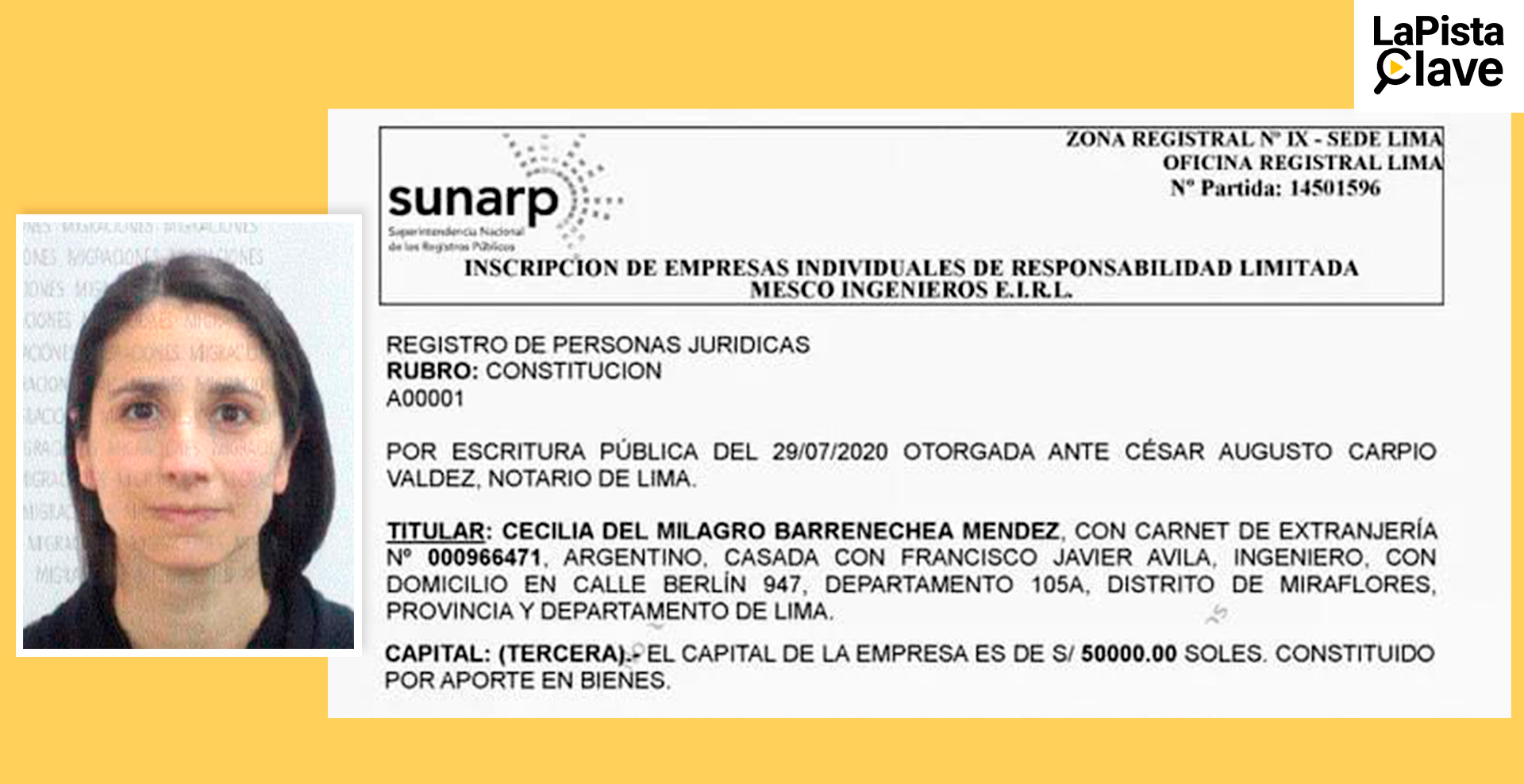 Cecilia Bernechea inscribió su empresa Mesco Ingenieros EIRL en Registros Públicos con un capital de 50 mil soles. Ahí consigna que está casada con Francisco Javier Avila apoderado de RIVA S.A sucursal Perú.