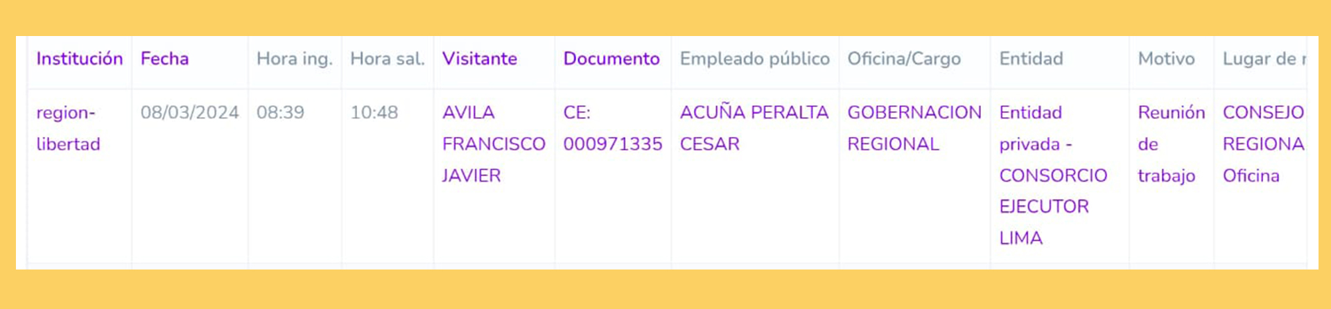 Este es el registro oficial de la reunión que tuvieron en la sede del gobierno regional de La Libertad, César Acuña y Francisco Javier Alva, natural de Salta, con carnet de extranjería 00971335. Ávila ingresó a las 8:39 am y se retiró a las 10:48 am. El motivo de su visita quedó consignado como “reunión de trabajo”