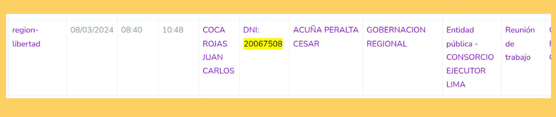 Y este es el registro de la visita a Acuña de Juan Carlos Coca, padre de Lucero Coca. Ingresó a las 8:40 am y se retiró a la misma hora que Avila, a las 10:48 am. Llegaron juntos y se fueron juntos.