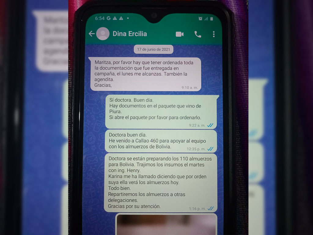 Según las pesquisas fiscales, el 19 de mayo de 2021, Boluarte participó en una reunión en la que el empresario prometió entregar el dinero para gastos de la batucada de acompañamiento musical en las actividades de Boluarte durante el final de la campaña de la segunda vuelta. “Se tendría que el dinero en mención se habría logrado entregar a Dina Boluarte Zegarra de manera directa o por intermedio de Marcela Saldarriaga Ortiz, en una fecha que oscila entre el 19 y 26 de mayo de 2021, sin descartarse que el intermediario de la recepción de dicho dinero pueda haber sido otra persona”, señala el documento fiscal.
