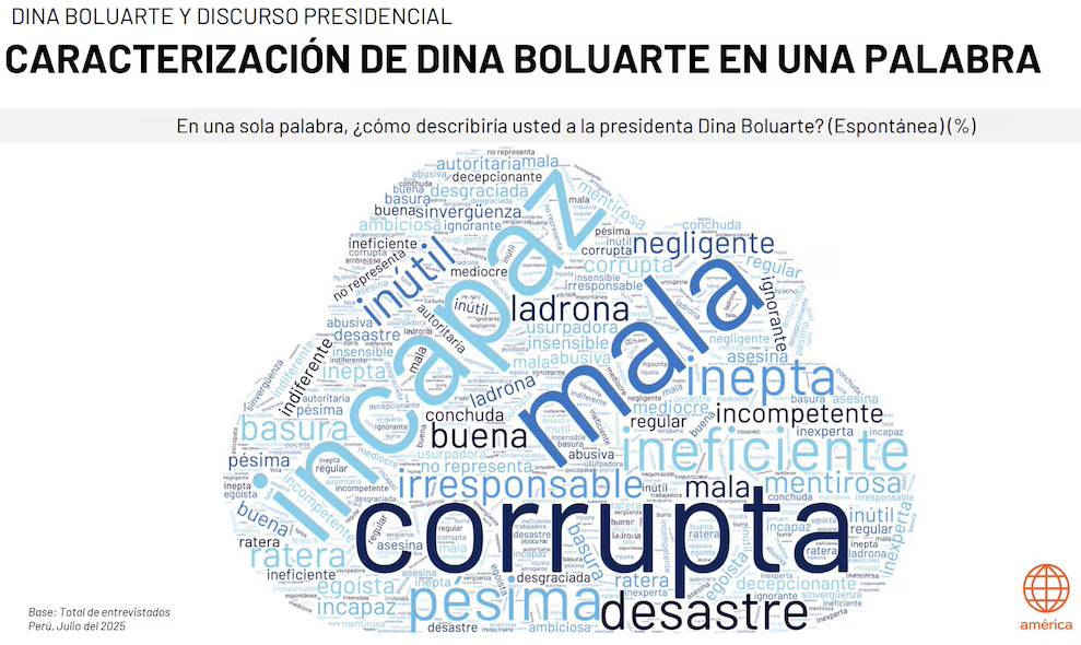 Entre tanto la empresa Ipsos Apoyo realizó una encuesta a nivel nacional de respuestas abiertas y espontáneas, con una sola pregunta: ¿cómo describiría a Dina Boluarte? El resultado fue una retahíla de palabras cargadas de indignación y rabia: Corrupta, inepta, ladrona, mentirosa, incapaz, mala, desastre, ratera, asesina, insensible, vergüenza, usurpadora, ignorante, basura, burra, conchuda, déspota. Ese mismo estudio de opinión arrojó que más del 50% cree que Dina Boluarte irá a la cárcel.