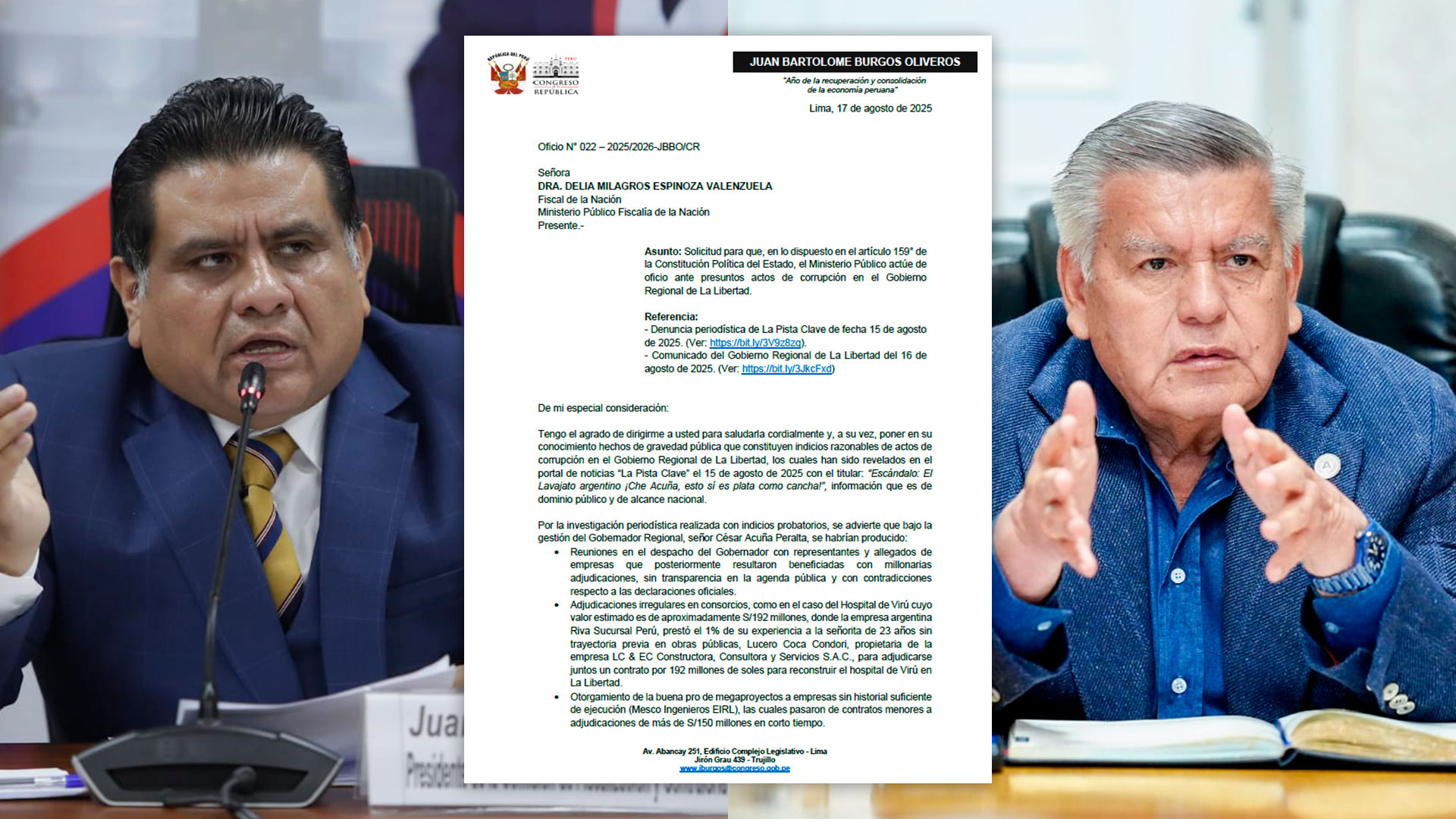 De otro lado, el congresista Juan Burgos, liberteño de nacimiento, ha emplazado y solicitado a César Acuña entregar toda la información documentada en torno a las denuncias de Lapistaclave.com. Además, ha remitido oficios a la Fiscal de la Nación para que actúe de oficio ante presuntos actos de corrupción en el Gobierno Regional de La Libertad.