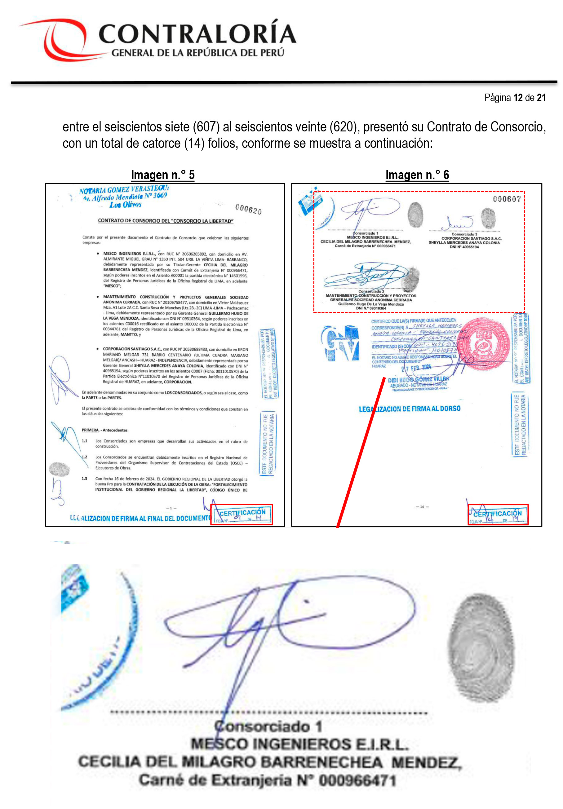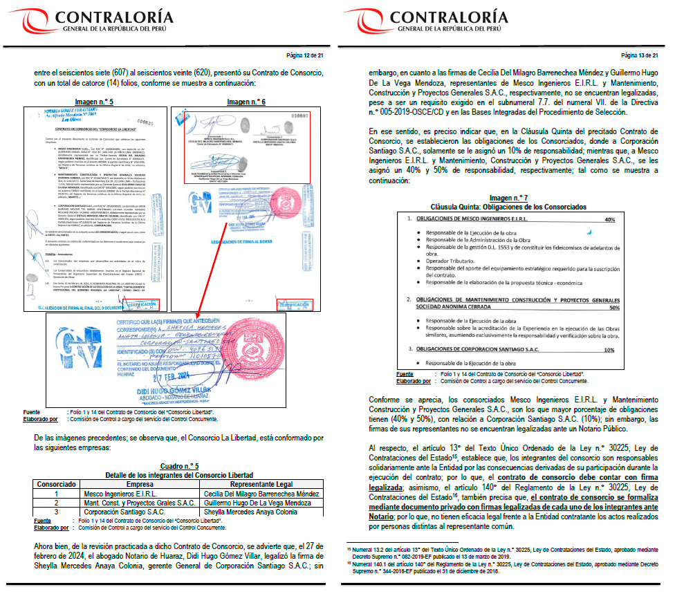 La Contraloría informa lo siguiente: “Se evidenció que el “Contrato de Consorcio” del consorcio La Libertad, solamente tiene la firma legalizada del representante legal de Corporación Santiago SAC, quien tiene un 10% de obligación, mientras que las firmas de los representantes de Mesco Ingenieros EIRL y Mantenimiento Construcción y Proyectos Generales SAC, quienes tienen 40% y 50% de obligaciones no se encuentran legalizadas”, advierte la Contraloría.