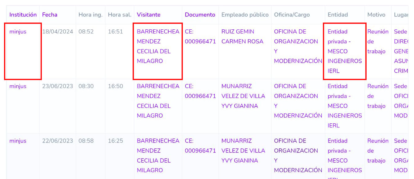 Aquí está el reporte de la visita de la señora Barrenechea al Ministerio de Justicia, de acuerdo al portal de Transparencia. Se reunió con la funcionaria Carmen Rosa Ruiz en la sede de la Dirección General de Asuntos Criminológicos.